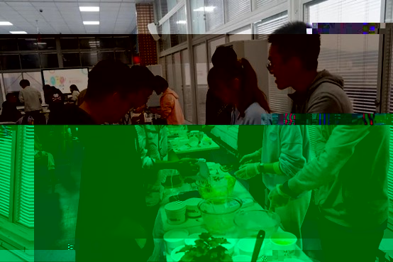愉快的動手環節來啦!現場的同學們自由組隊分成五個小組,分别制作瑪芬蛋糕、曲奇餅幹和手工蔓越莓餅幹。從“精細化”稱量食材,到“健身式”攪拌均勻,再到“天馬行空”的創新制作,同學們分工協作,其樂融融,學院老師們也參與其中,一起享受烘焙的過程,品嘗烘焙的成果。